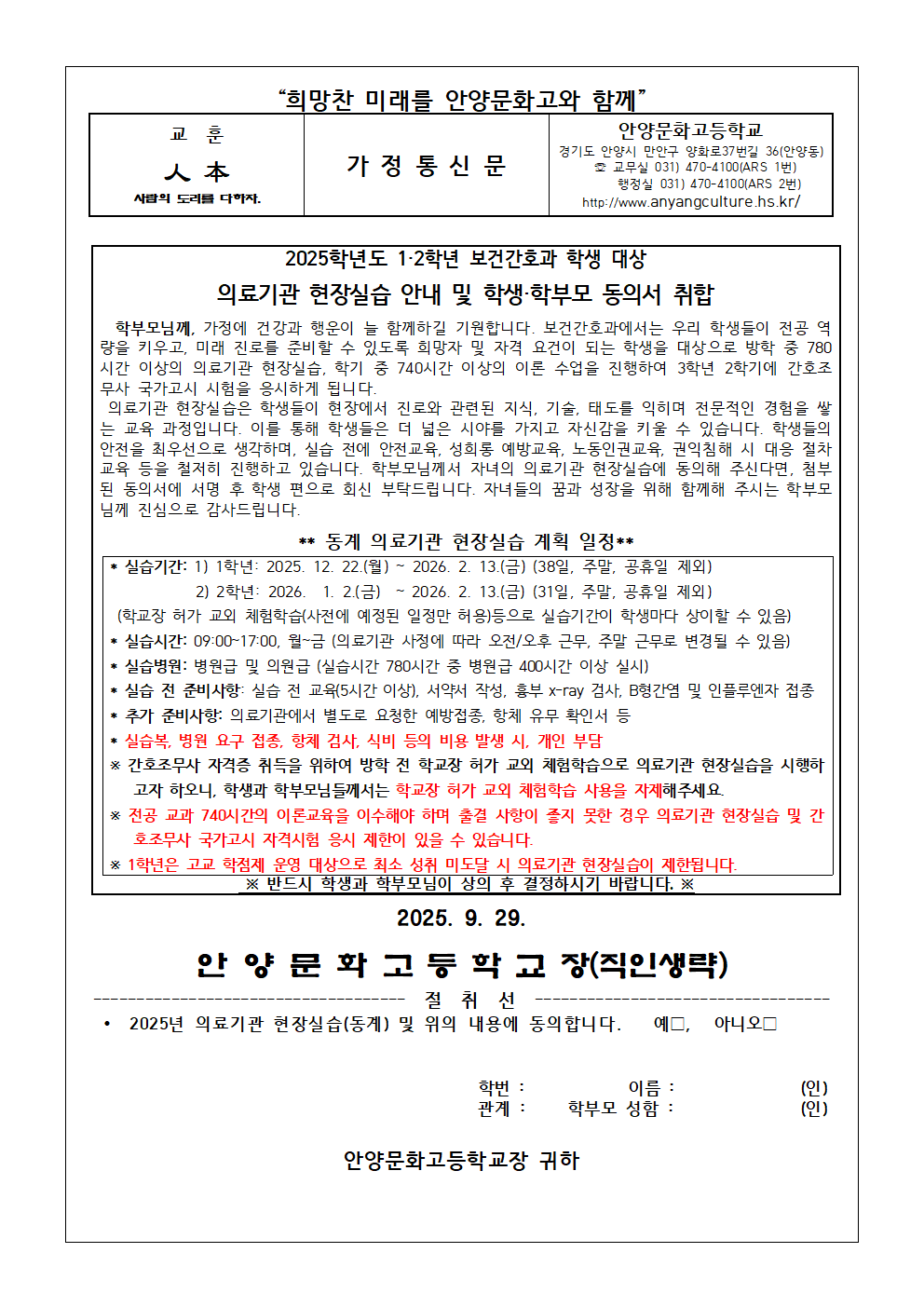 2025학년도 1,2학년 보건간호과 학생 대상 의료기관 현장실습 안내 및 동의서 취합