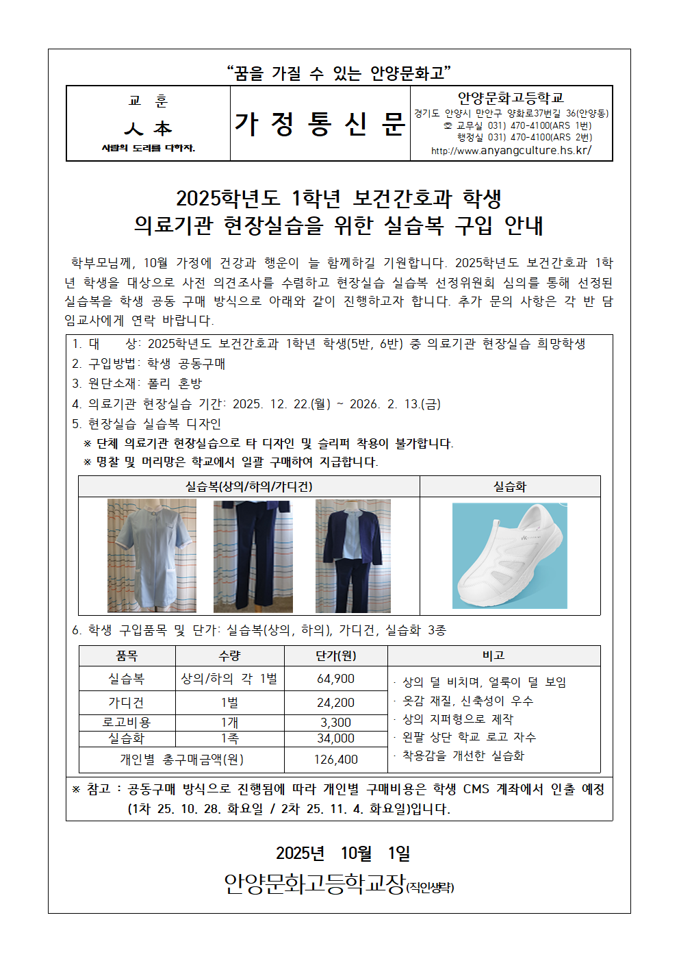 2025학년도 보건간호과 1학년 의료기관 현장실습 실습복 구매 안내