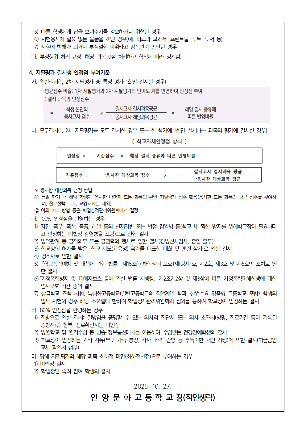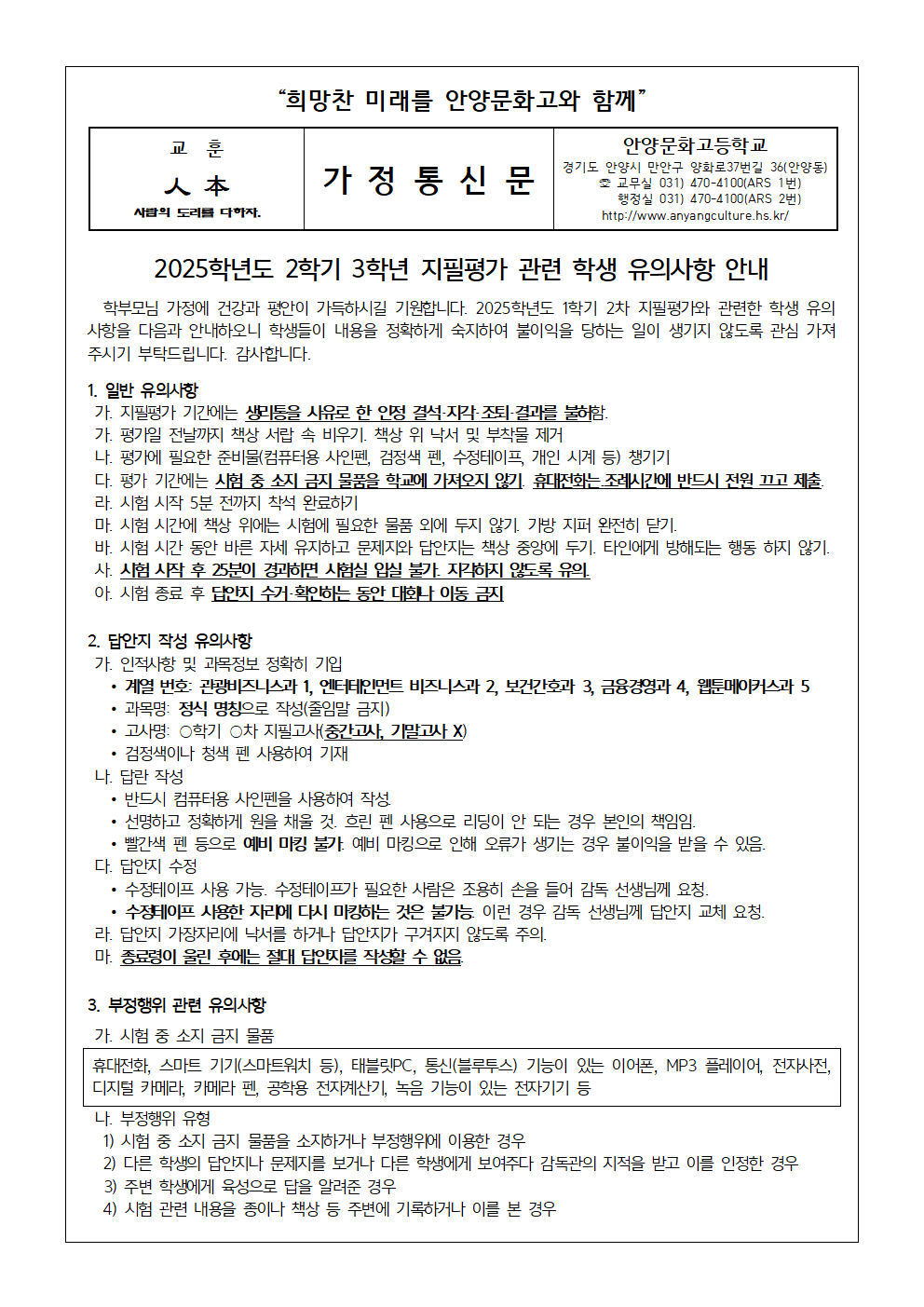 2025학년도 2학기 1, 2학년 지필평가 관련 학생 유의사항 안내